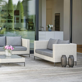 Die Kombination aus hochwertigem Kunststoffgeflecht auf der einen Seite und geradlinige Formensprache moderner Design-Möbel auf der anderen Seite zeichnen diese Gruppe aus. Ein spannender Materialmix kann mit Sesseln und einem Tisch aus Edelstahl erzeugt werden.