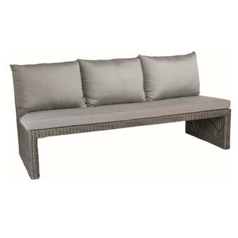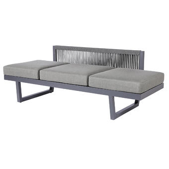 Mehrfachfunktionale Dining Lounge/Bank und Liege in einem Produkt vereint. Aluminiumgestell in Dunkelgrau, pulverbeschichtet kombiniert mit einem 14 mm breiten Rope-Band in Dark Grey oder Light Grey. Beide Kopfteile sind 3-fach höhenverstellbar. Inkl. drei Sitz- und zwei Rückenkissen mit wasserabweisendem Olefin-Stoff von Sunproof®. Beine mit Schraubfüßen für Niveauausgleich.