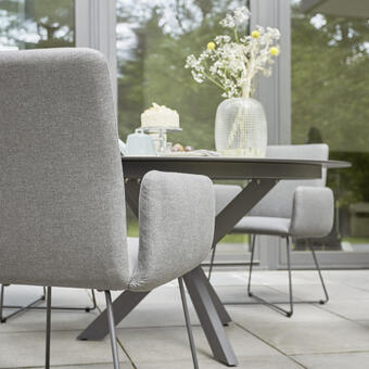 Moderner und sehr komfortabler Armlehnenstuhl, der sich mit vielen Tischvariationen individuell kombinieren lässt. Die Sitzschale ist mit grauem wasserundurchlässigem Markenstoff von Tuvatextil® bezogen (100% spinndüsengefärbte Acryl-faser mit einer Unterbeschichtung). „Cross“-Untergestell aus Edelstahl Dunkelgrau pulverbeschichtetet. Als Kufe und Kreuzfuß lieferbar.