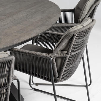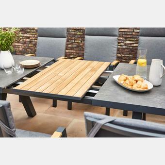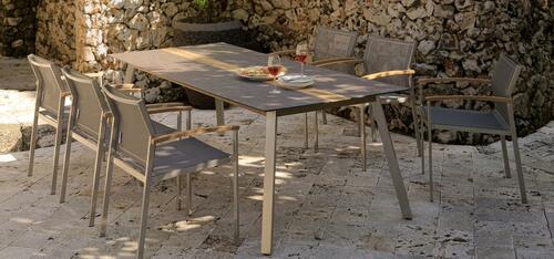 RIVERA Dining Sessel mit Tisch OMNIGO Teak 150cm. Verschiedene Tischvarianten auch mit wetterfesten TRESPA Platten. Sesselfarben: black, charcoal, creme white, champagner.
