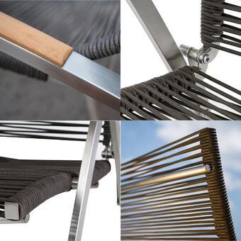 Verarbeitet ist Hochwertiger Edelstahl mit einer Bespannung aus wasserabweisendem Sunproof Sling® in schwarz/silber. Die umlaufenden Armlehnen sind aus recyceltem, alten Teakholz gefertigt. Jedes Element hat Schraubfüße für den Niveauausgleich.