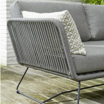 Mehrfachfunktionale Dining Lounge/Bank und Liege in einem Produkt vereint. Aluminiumgestell in Dunkelgrau, pulverbeschichtet kombiniert mit einem 14 mm breiten Rope-Band in Dark Grey oder Light Grey. Beide Kopfteile sind 3-fach höhenverstellbar. Inkl. drei Sitz- und zwei Rückenkissen mit wasserabweisendem Olefin-Stoff von Sunproof®. Beine mit Schraubfüßen für Niveauausgleich.