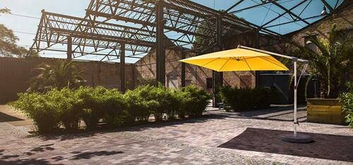 Ganz schön praktisch: Der Mast des SOMBRANO S+ steht neben der Schattenfläche, weswegen Sie den Raum darunter frei nutzen können. Dank der Lenkstange kann das Schirmdach auf beiden Seiten bis zu 54° geneigt werden. Durch das Betätigen des kugelgelagerten Drehfusses lässt er sich zudem kinderleicht 360° um die eigene Achse drehen.